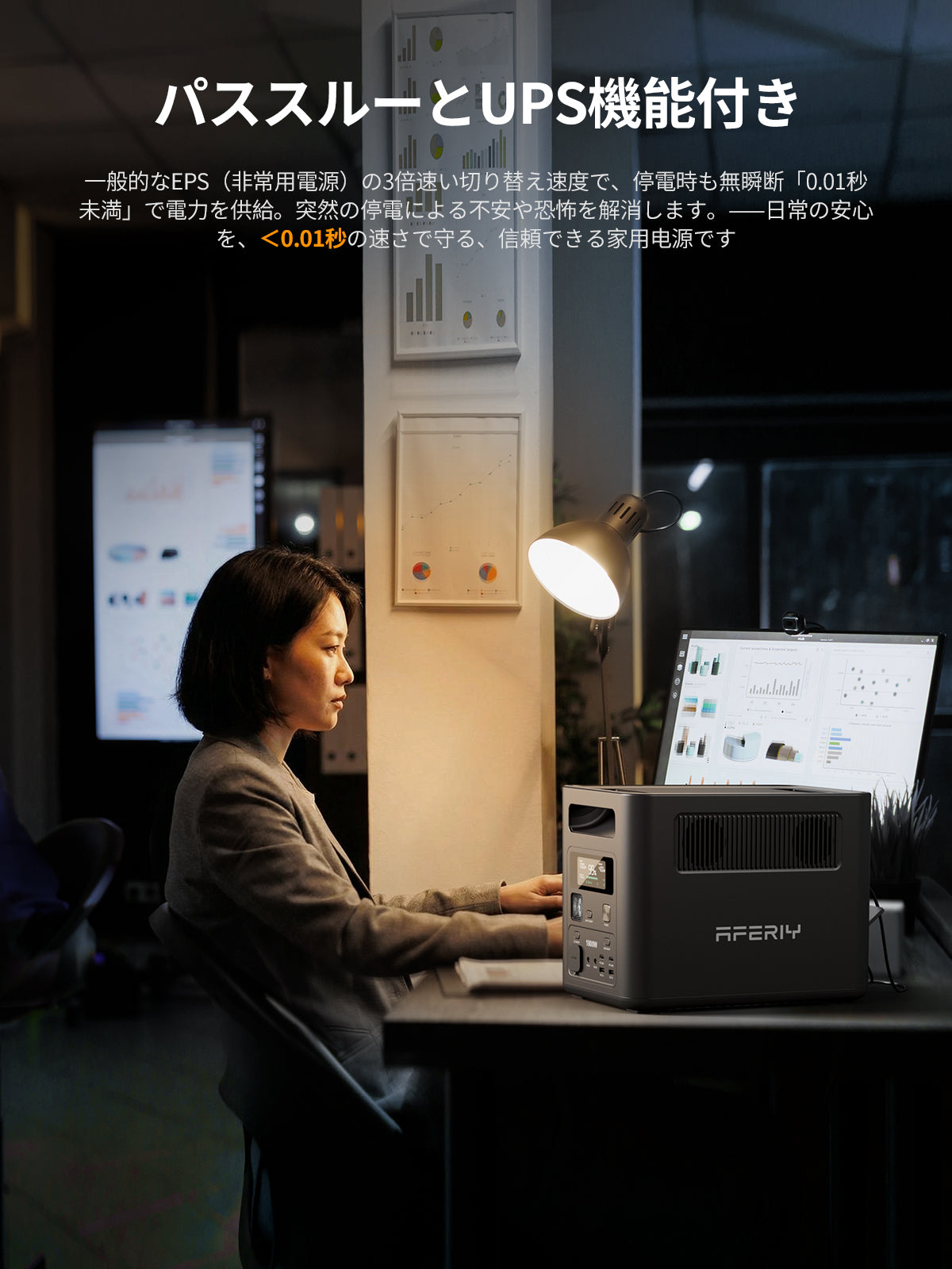 突然の停電時でも、10ms未満で自動的にバッテリー給電へ切替。 パソコン、ルーター、冷蔵庫、CPAP機器などの 精密機器を中断なく使用できます。